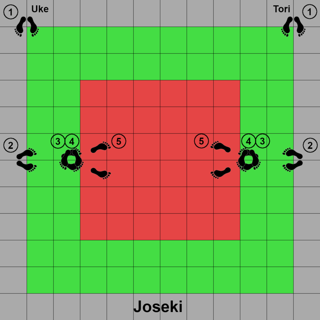 Von der Position 2 zur Position 1 darf vorwärts mit Aiyumi-Ashi gegangen werden. (Joseki darf der Rücken zugedreht werden.)